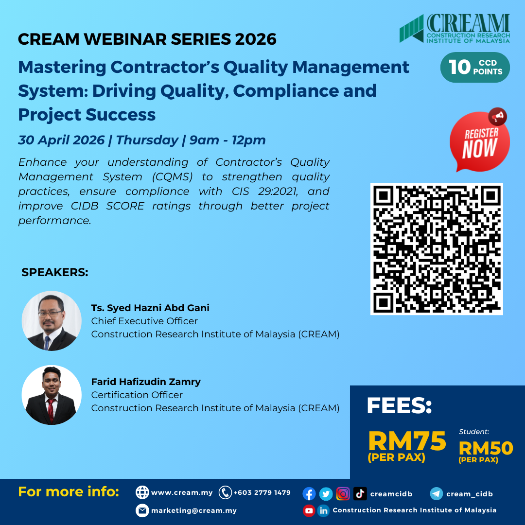 Construction Research Institute of Malaysia (CREAM) is back with CREAM Webinar Series 2026. This monthly webinar series aims to create a platform for industry practitioners and academia to initiate conversations on issues, challenges, opportunities, and initiatives for the construction industry.